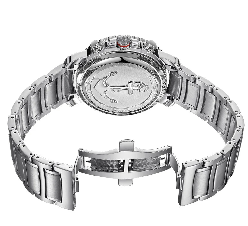 Das Modell wird durch ein elegantes Edelstahlarmband mit Faltschließe abgerundet, das nicht nur einen sicheren Halt bietet, sondern auch den sportlich-eleganten Charakter der Uhr unterstreicht. Diese Kombination aus Funktionalität und Ästhetik macht den Challenger Deep Chronograph zu einem idealen Begleiter – sei es im Büro, bei Outdoor-Abenteuern oder festlichen Anlässen.
